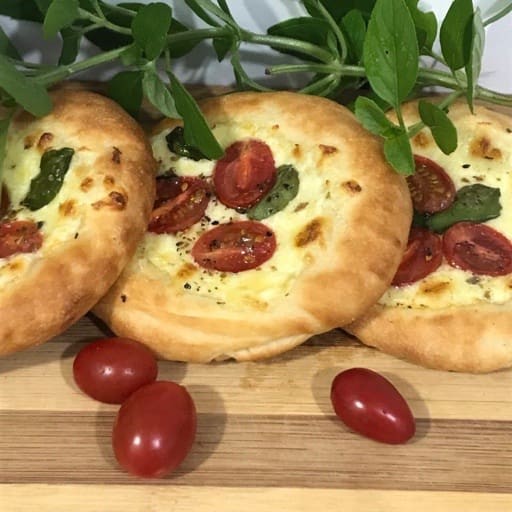 Massa exclusiva da casa com recheio de queijo mussarela, tomate cereja, majericão fresco e orégano! Uma das esfirras mais vendidas da casa ao seu alcance! Saborosa e aromática! Experimente!