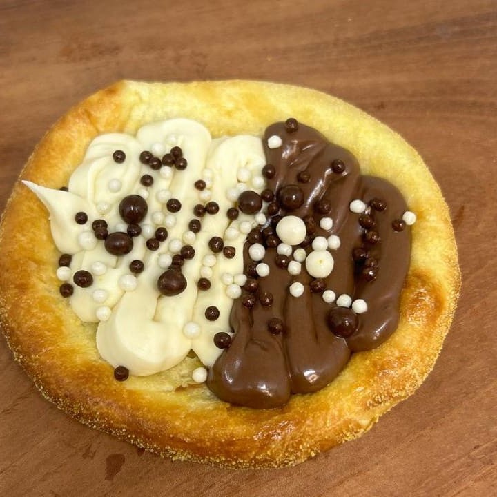 Massa especial, recheada com chocolate e chocolate branco.