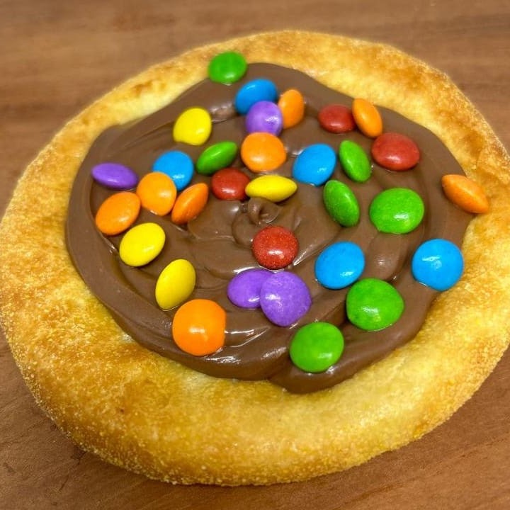 Massa especial, recheada com chocolate, coberta com chocoball. (Flocos de Arroz, envoltos de chocolate)