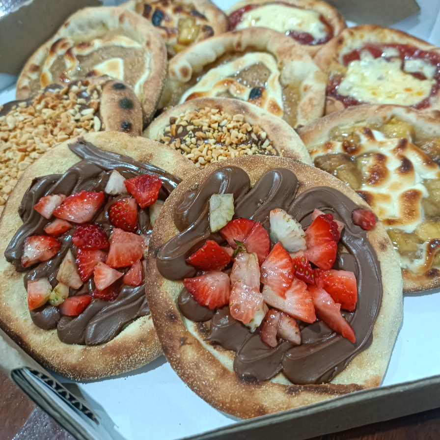 5 Bacon com milho, 5 Carne com bacon, 5 Calabresa com queijo, 3 Banana nevada.