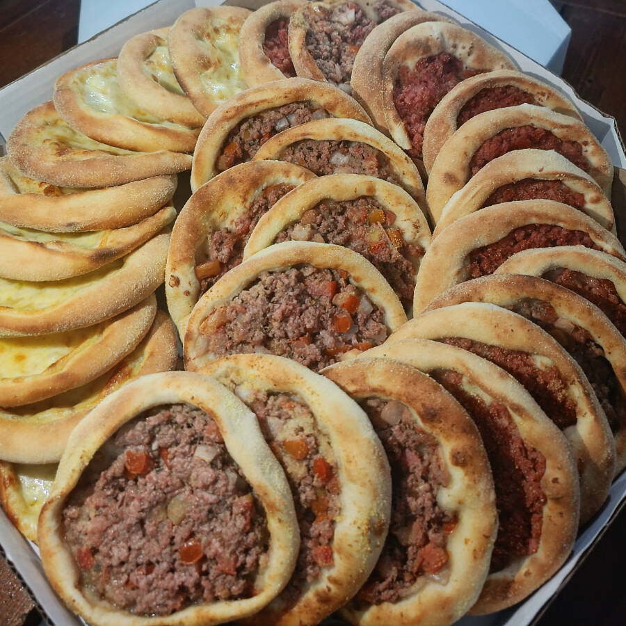 5 Esfihas de carne, 5 Esfihas de pizza, 5 Esfihas de Bacon c/ Batata Palha, 5 Esfihas de Chocolate.