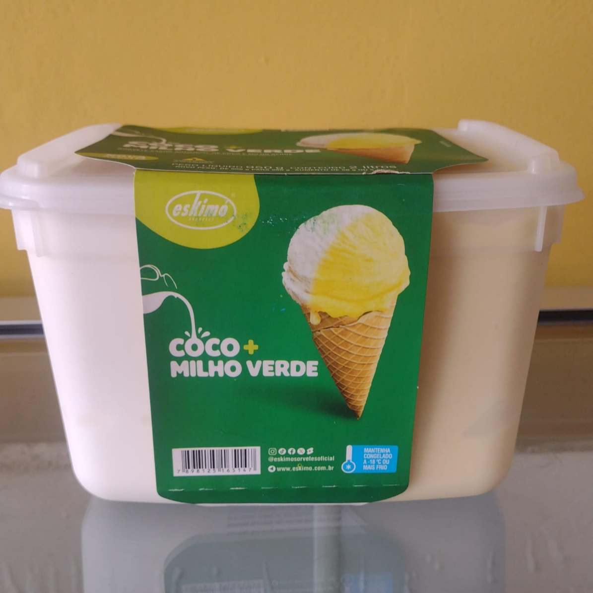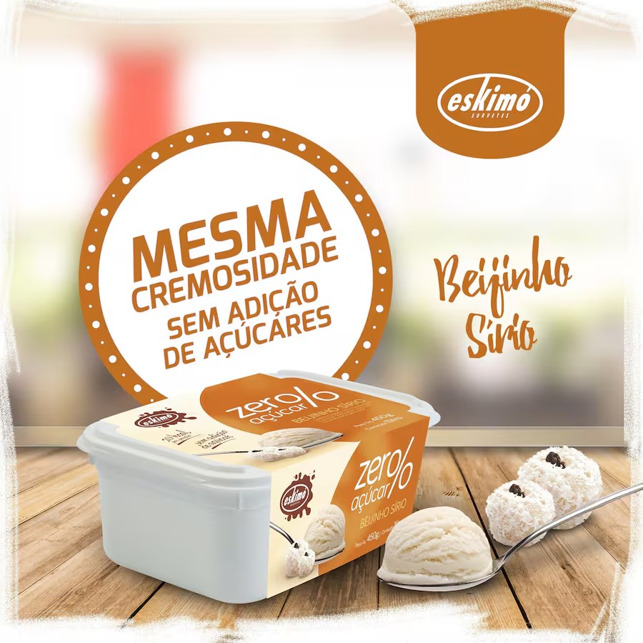 Sabor chocolate branco com casquinha de chocolate branco e flocos de arroz.