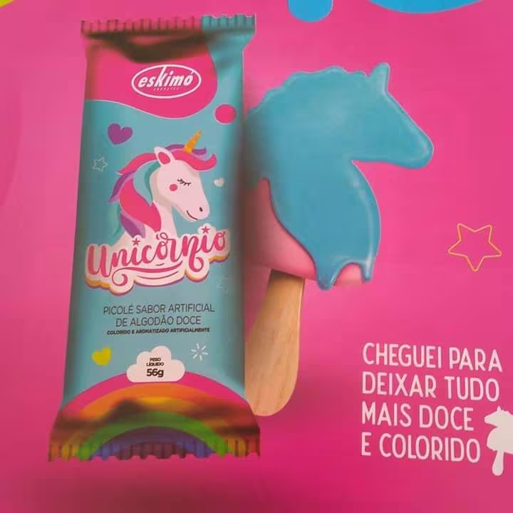 Picolé em forma de unicornio sabor artificial algodão doce.