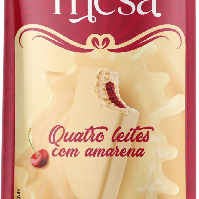 Picolé sabor nata, leite de coco,leite condensado, recheado com amarena e coberto com chocolate branco.