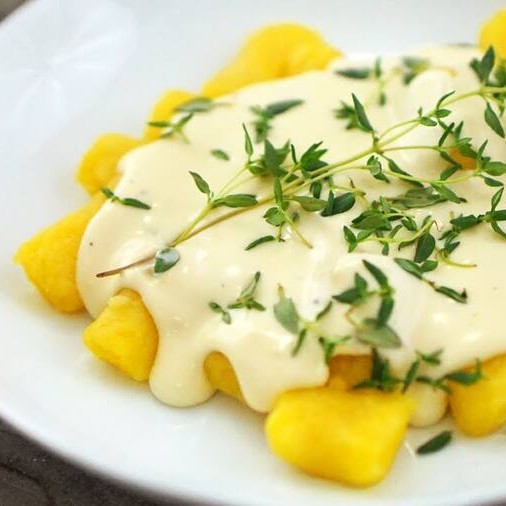 Creme de batata, creme de cenoura e carne bovina em pedaço