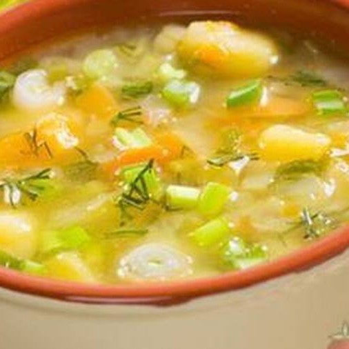 Caldo de legumes, batata, cenoura, couve flor, brócolis, chuchu, ervilha, milho, vagem, macarrão e carne bovina