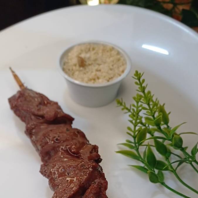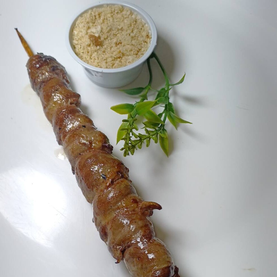 Não Acompanha Farofa Espetinho de coração assado na brasa, temperado na casa.