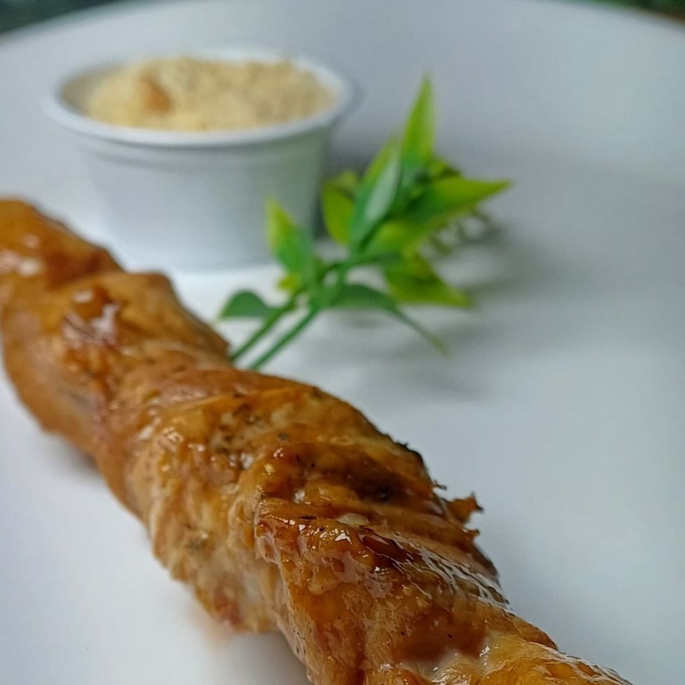 Espetinho de frango, com um temperinho especial, leve e suculento.