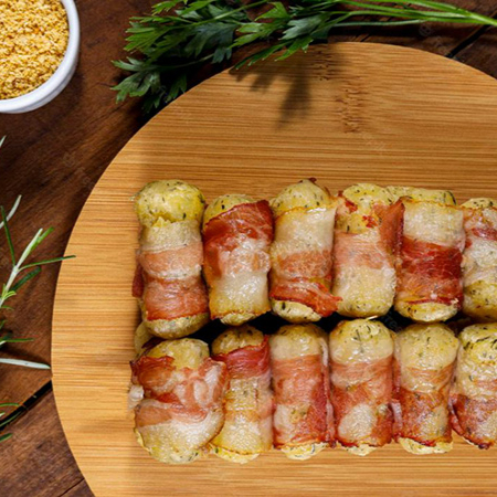 Composição: pedaços de lombo enrolados com fatia de bacon. Pacote de 500g = 5 unidades 100g cada. Embalados á vácuo, tempero suave e prontos para assar.