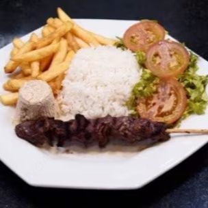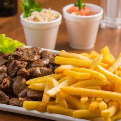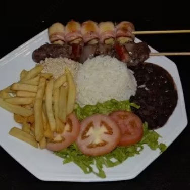 150g arroz, 120g de feijão preto, 120g batata palito, 15g de farofa, salada e 2 espetinhos tradicional (100g cada)