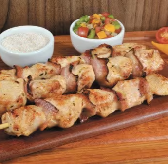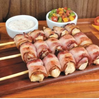 Cubos de frango intercalado com fatias de bacon, grelhado no ponto certo para manter toda a meciez e sabor da carne. Feito na brasa, com tempero especial da casa, ideal para quem aprecia um espetinho de qualidade (100g in natura)