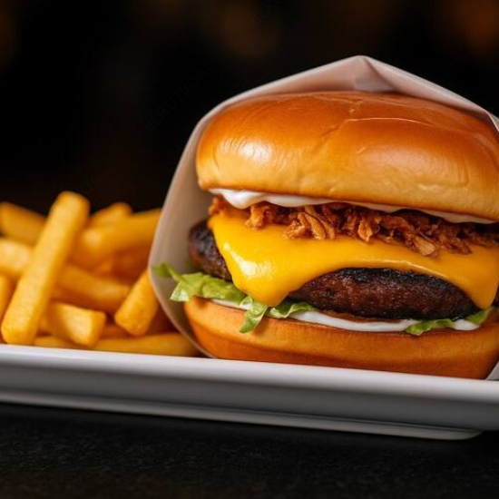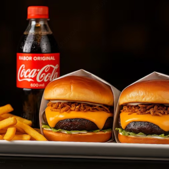 Delicioso angus burguer de costela com dois hamburgueres de 150g, pão brioche macio, saborosa maionese de alho da casa, cebola crispy, alface picado, tomate em rodelas e cheddar fatiado, acompanha 100g batata frita.