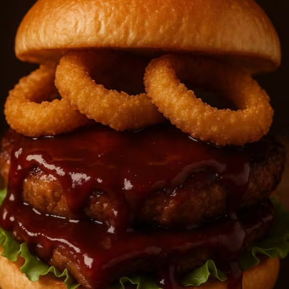 Delicioso angus burguer de costela de 150g, pão brioche macio, saboroso molho barbecue da casa, onion rings, alface picado, tomate em rodelas e cheddar fatiado, acompanha 100g batata frita.