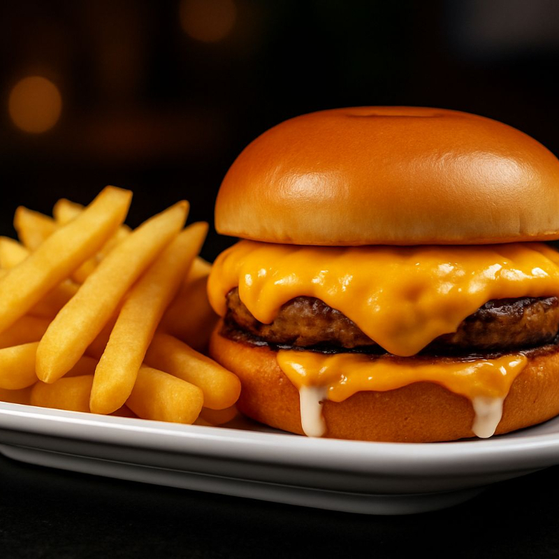 Delicioso angus burguer de Frladinha de 150g, pão brioche macio, saborosa maionese de alho da casa, cebola crispy, alface picado, tomate em rodelas e cheddar fatiado, acompanha 100g batata frita.