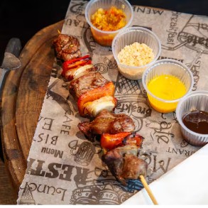 Espetinho Xixo Brasileiro (alcatra, Pimentão, Cebola E Bacon)