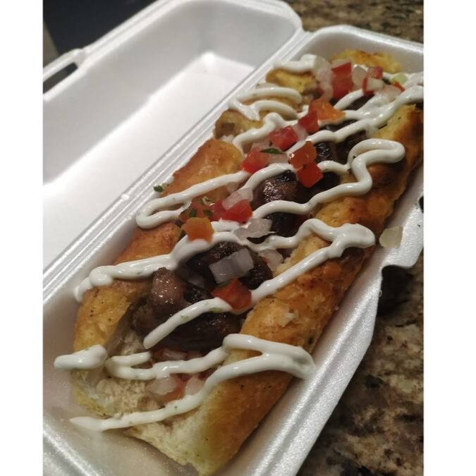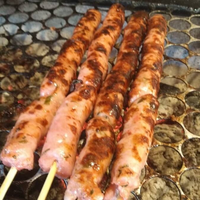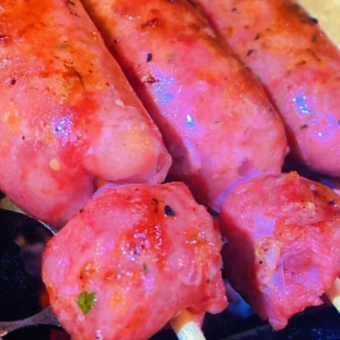 Pão de alho, 1 espetinho linguiça toscana, maionese da casa e vinagrete.