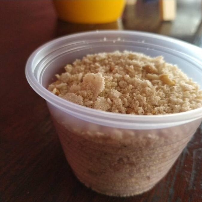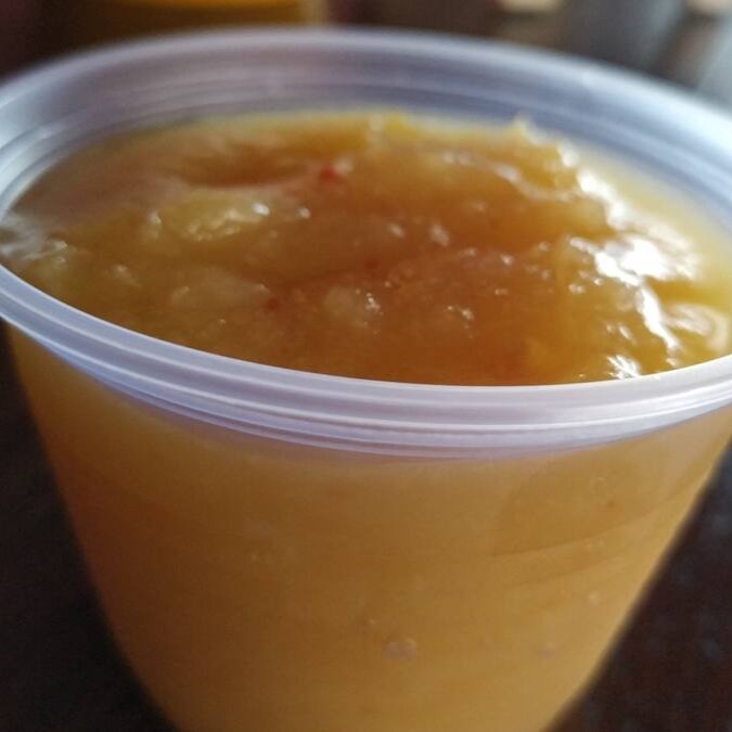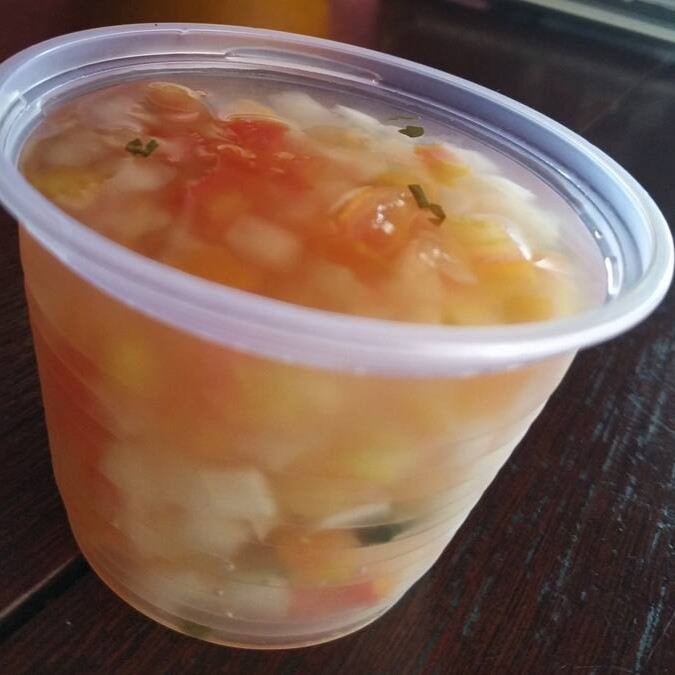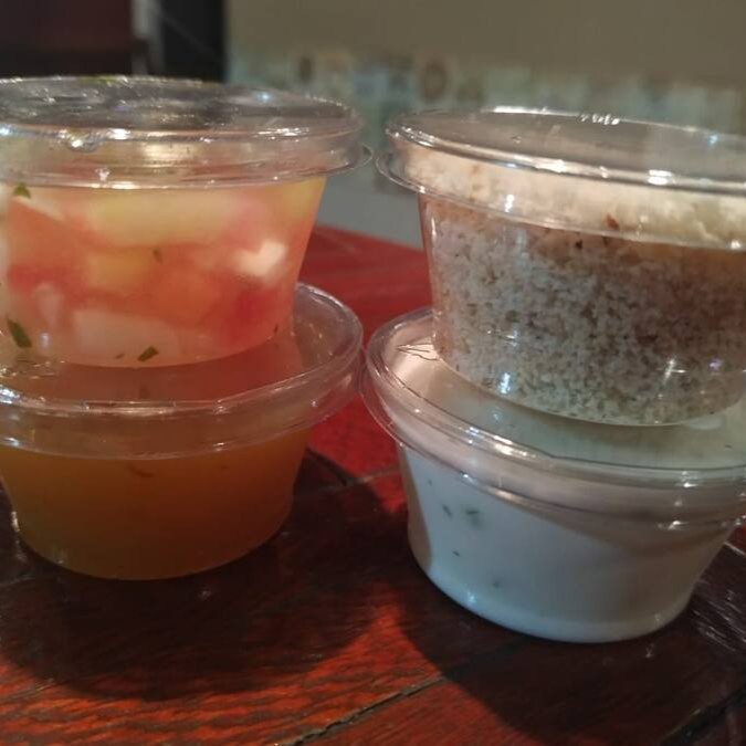 1 vinagrete, 1farofa, 1maionese de alho, 1geléia de abacaxi com pimenta.