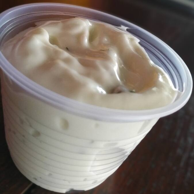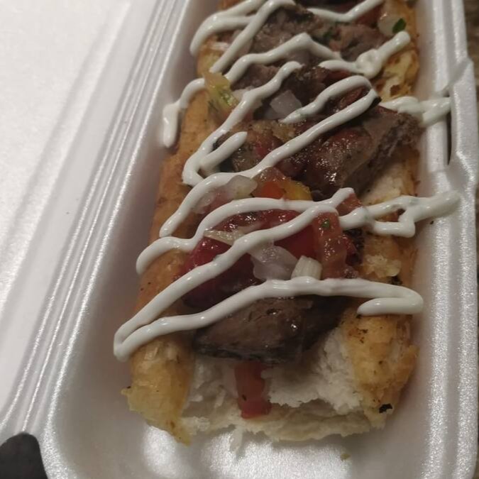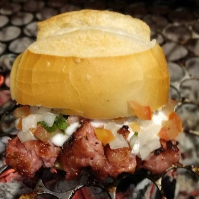 Pão francês, maionese da casa, 1 espetinho de carne, e vinagrete.