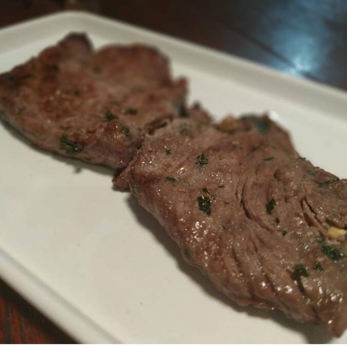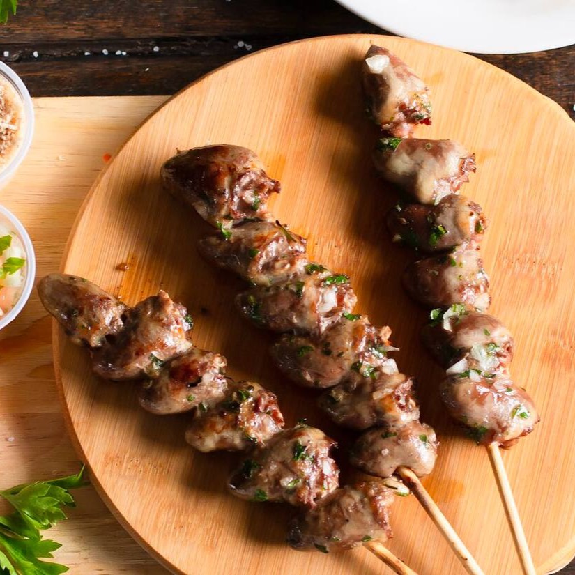Pão de alho, 1 espetinho de coração, maionese da casa e vinagrete.