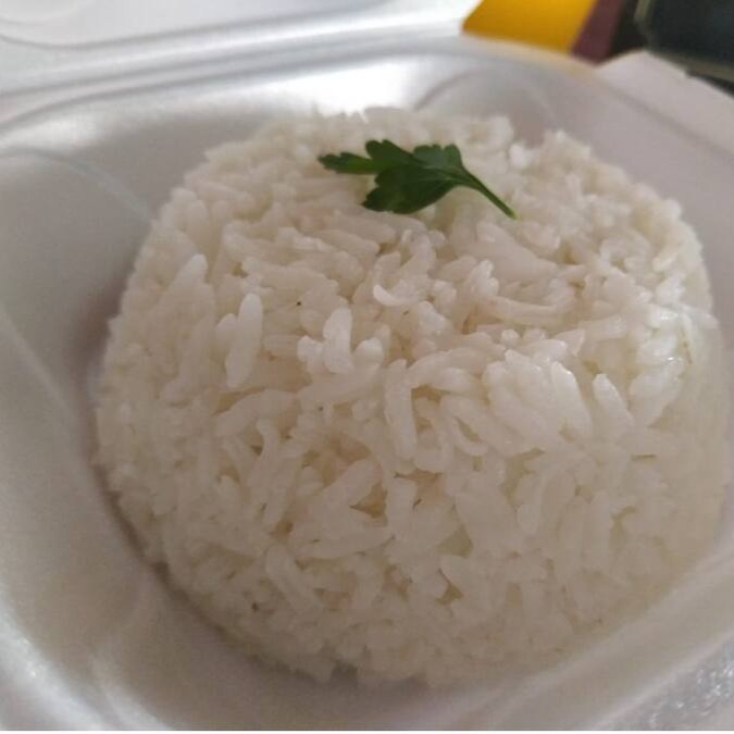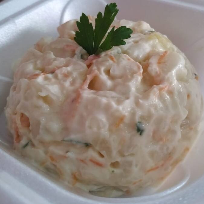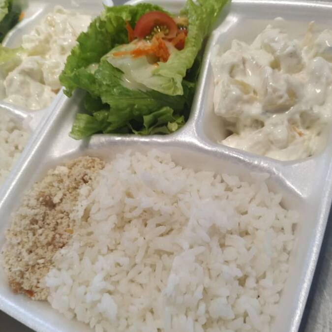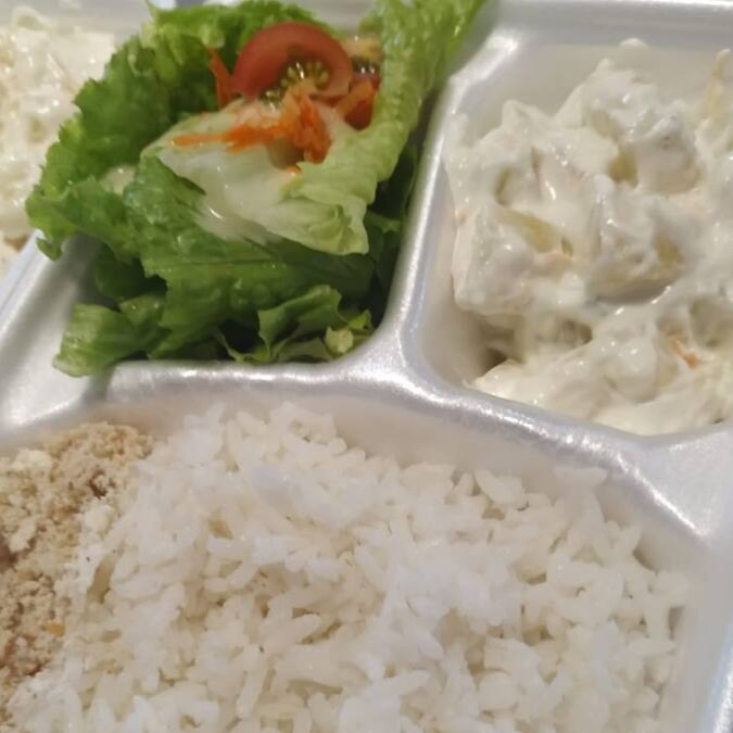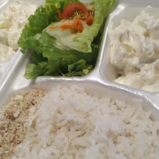 Arroz branco, feijão, farofa crocante, 1 espetinho de carne, maionese de batata, salada de folhas verde com molho parmesão.