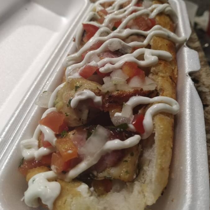 Pão francês, maionese da casa, 1 espetinho de frango com bacon e vinagrete.