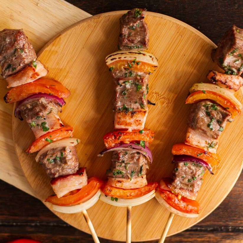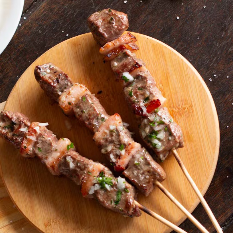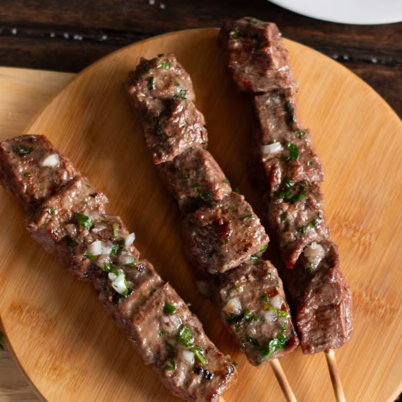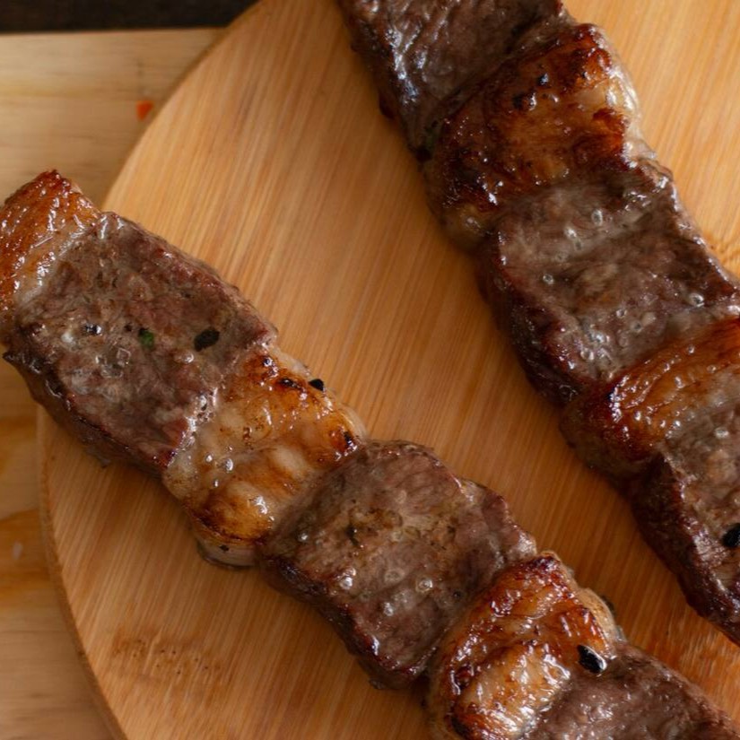 Pão de alho, 1 espetinho de picanha, maionese da casa e vinagrete.