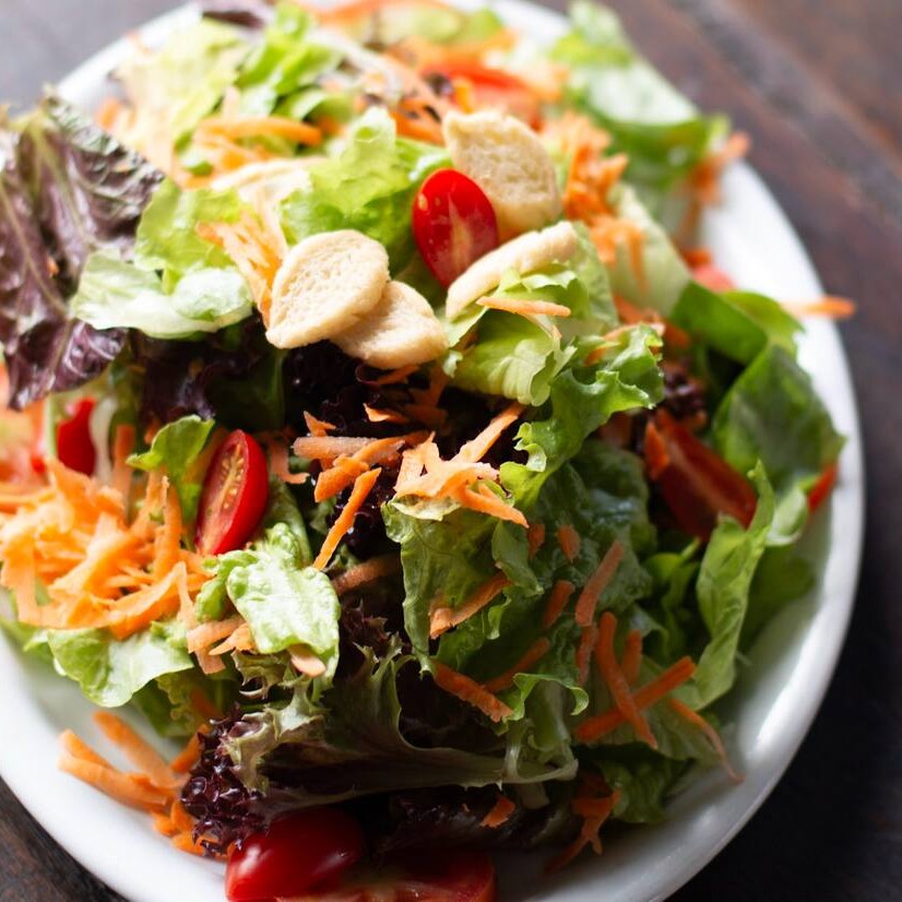 Alface crespa, Alface roxa, alface americana, rúcula, tomate, cenoura ralada, tomate cereja, molho parmesão e crótons.