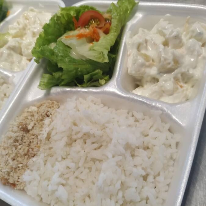 Arroz branco, feijão, farofa crocante, 1 espetinho de xixo, maionese de batata e salada de folhas verdes com molho parmesão.
