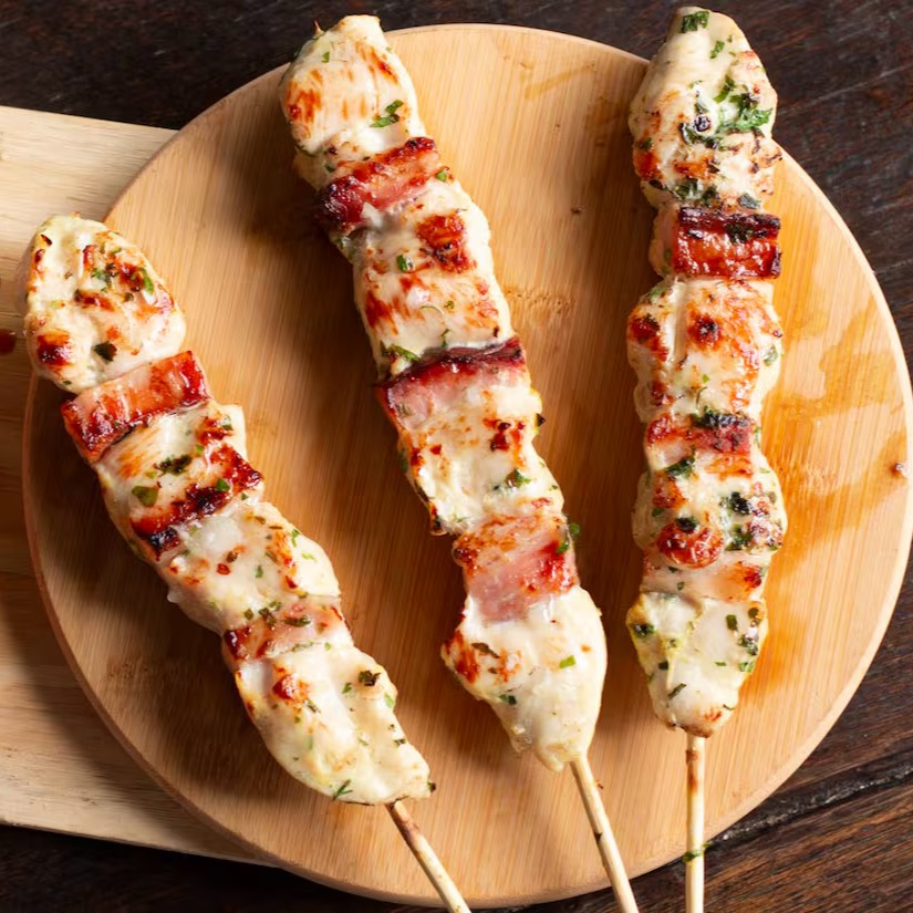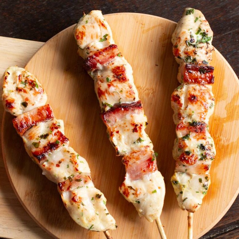 Pão de alho, 1 espetinho de frango com bacon, maionese da casa e vinagrete.