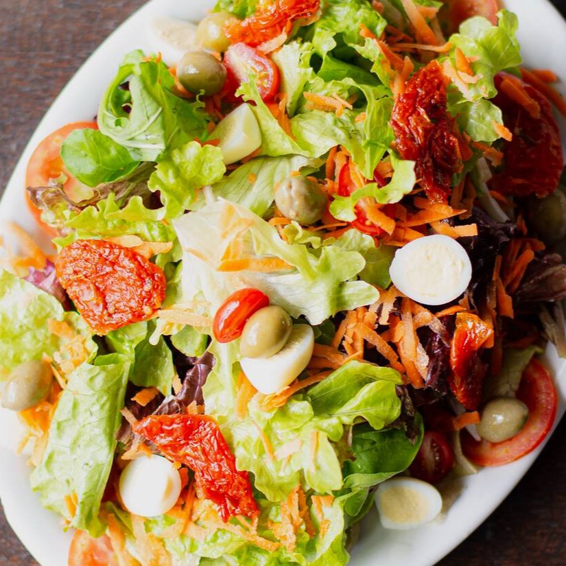 Alface crespa, alface roxa, alface americana, rúcula, tomate, cenoura ralada, tomate cereja, ovo de codorna, tomate seco, azeitona e molho de mostarda.