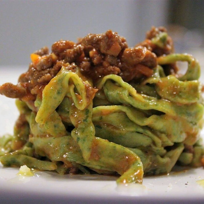 Talharim Verde de espinafre preparado artesanalme ao molho bolonhesa