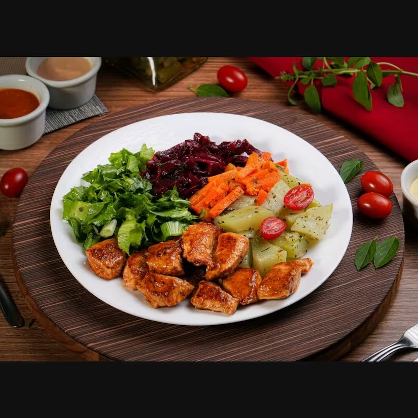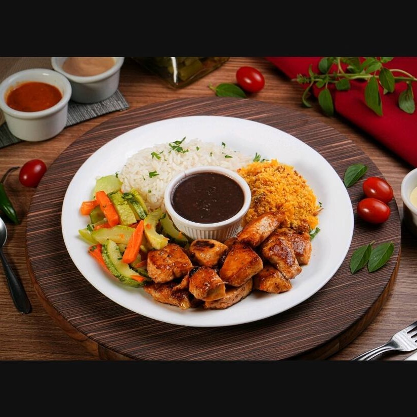 Desfrute dos nossos suculentos 'Cubos de Frango Grelhado', delicadamente grelhados na chapa para realçar o sabor. Acompanhados de