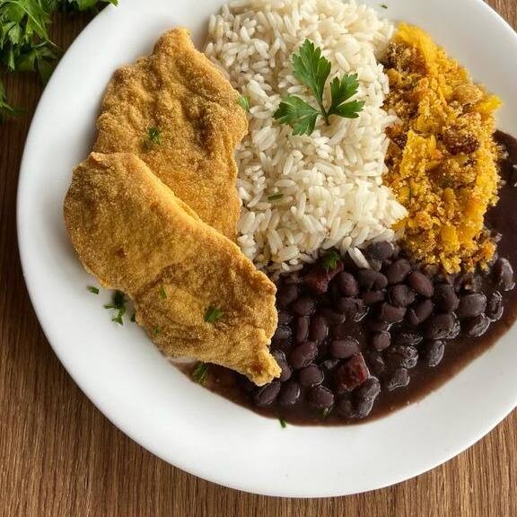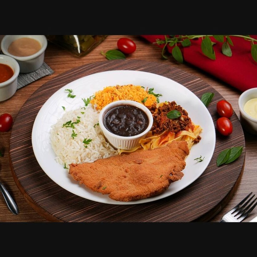 Acompanha: arroz branco,feijão preto, farofa, macarrao bolonhesa e calabresa acebolada na chapa