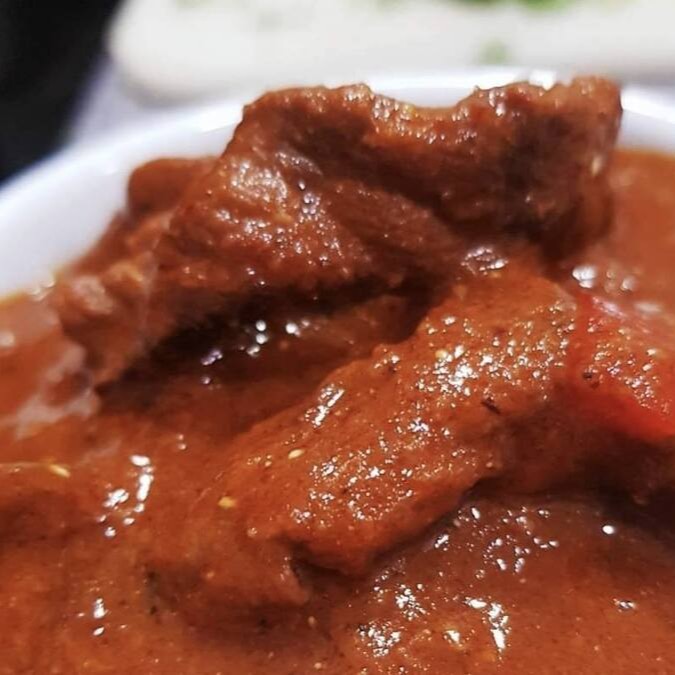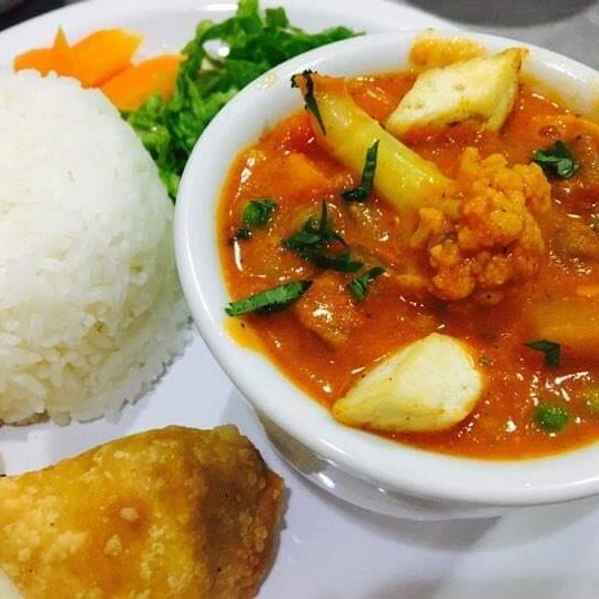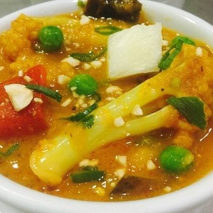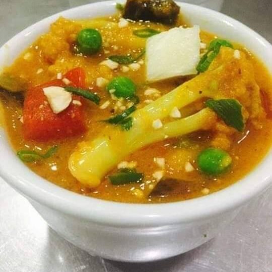 Mix de nove tipo de vegetais preparados com creme de caju e leite de coco fresco temperado com masalas.
