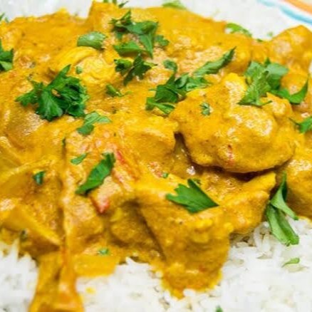 Cubos de peito de frango cozido com creme de espinafre,molho de tomate e especiarias.Acompanha:arroz e samosa