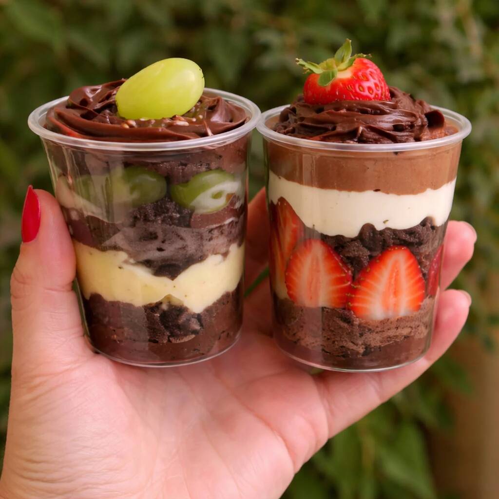 Dois copos da felicidade, cada um com 150ml, super recheados, montados em camadas generosas de brownie, creme e muito chocolate. Um traz a combinação deliciosa com uva e chocolate cremoso por cima, e o outro vem com pedaços de morango fresquinho, mousse e uma cobertura irresistível. Bonitos de ver e ainda melhores de provar. 🍫🍓🍇
