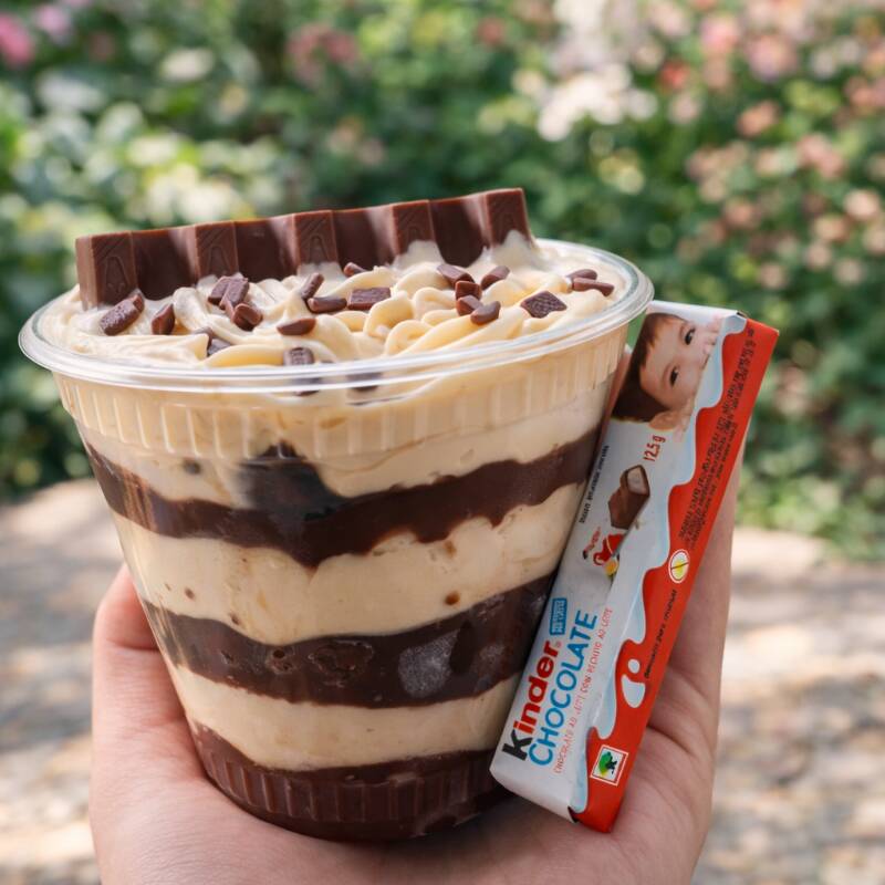 Camadas de brigadeiro branco cremoso, brigadeiro 50% e pedaços de Kinder, finalizado com chocolate por cima. Um copo super recheado e irresistível.