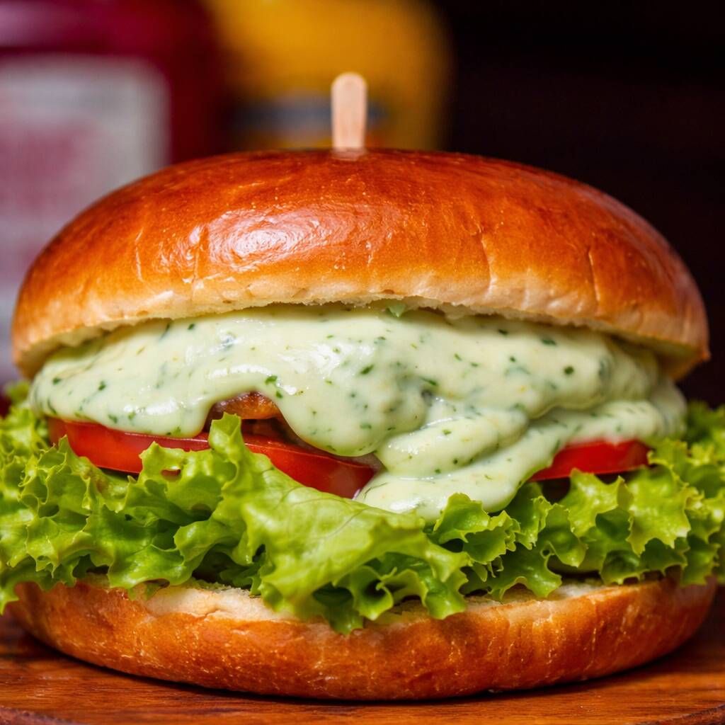 Pão de Hambúrguer, frango desfiado, hambúrguer artesanal alto de 150 gramas, queijo, presunto, milho, ervilha, tomate, alface e maionese caseira