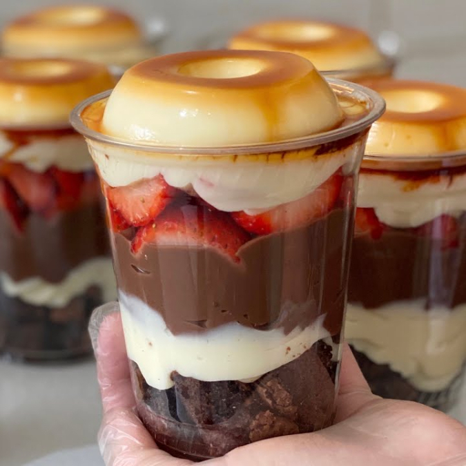 Camadas irresistíveis de creme sabor morango, recheio cremoso, brownie macio e finalizado com deliciosos pedacinhos crocantes de chocolate rosa por cima. Um copo lindo, cremoso e cheio de sabor que conquista já na primeira colherada! 💗🍫