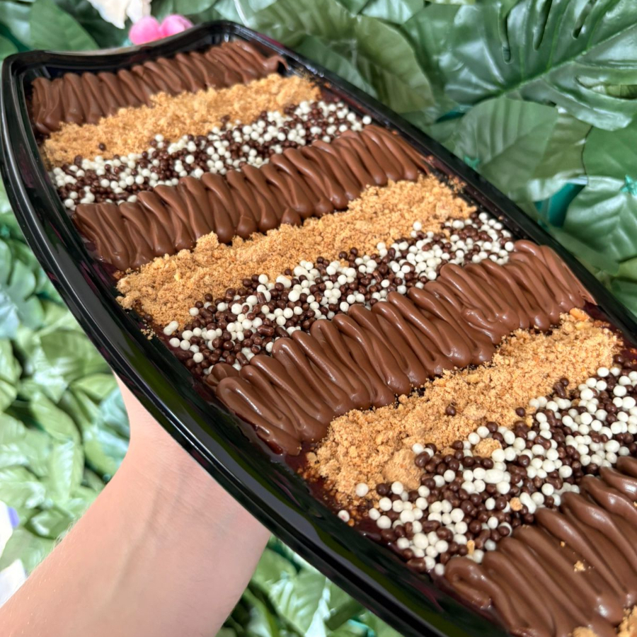Chocolate cremoso, coco ralado, leite condensado e banana