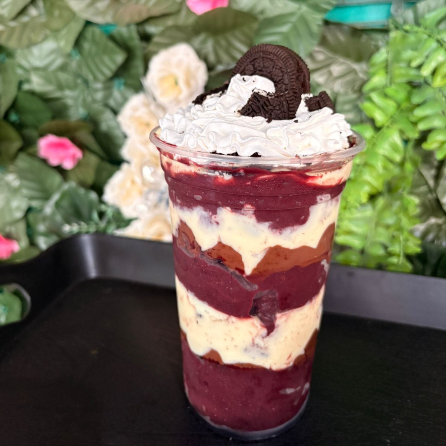 Creme ninho, chocolate preto, oreo e chantilly