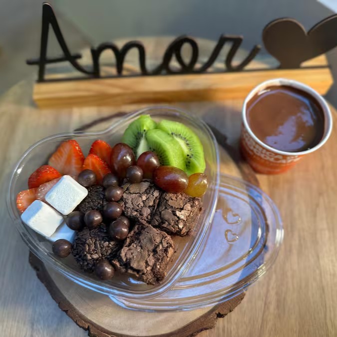 Fondue em formato de coração, com frutas frescas, brownie, marshmallow, chocoboll e chocolate para curtir.