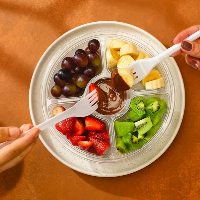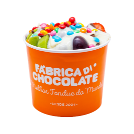 Fondue com frutas e chocolate em uma embalagem para curtir acompanhado.