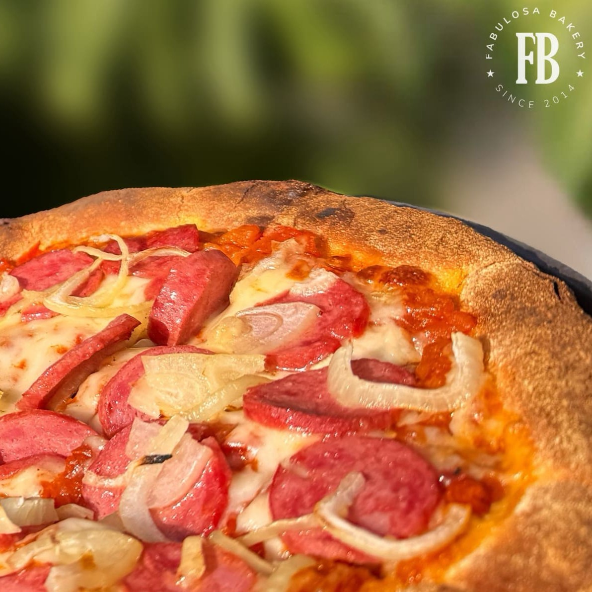 Massa crocante de fermentação longa e natural, molho de tomate artesanal, muçarela, calabresa e fatias de cebola.