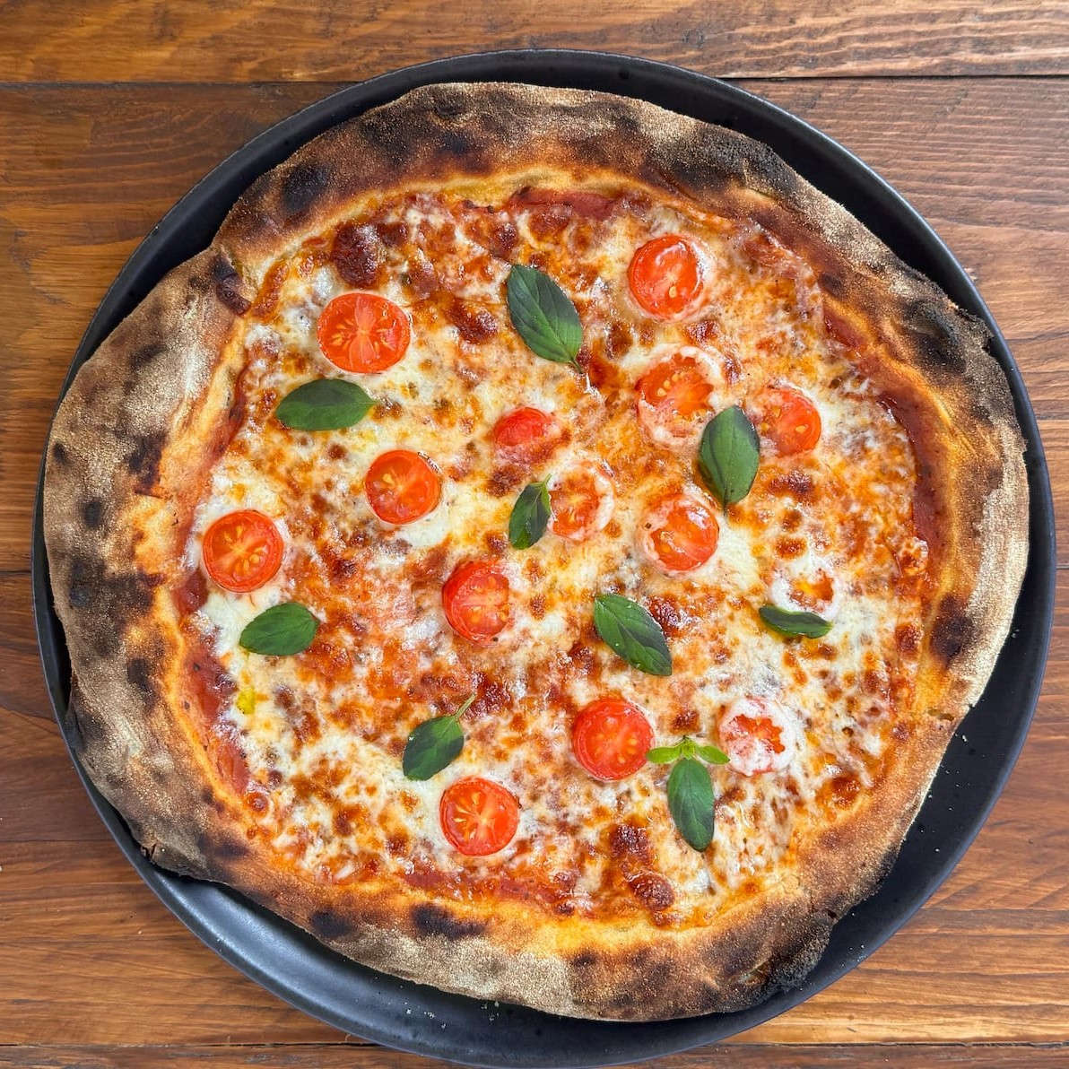 Massa crocante de fermentação longa e natural, molho de tomate artesanal, muçarela, tomate cereja e folhas de manjericão. Aprox 28cm