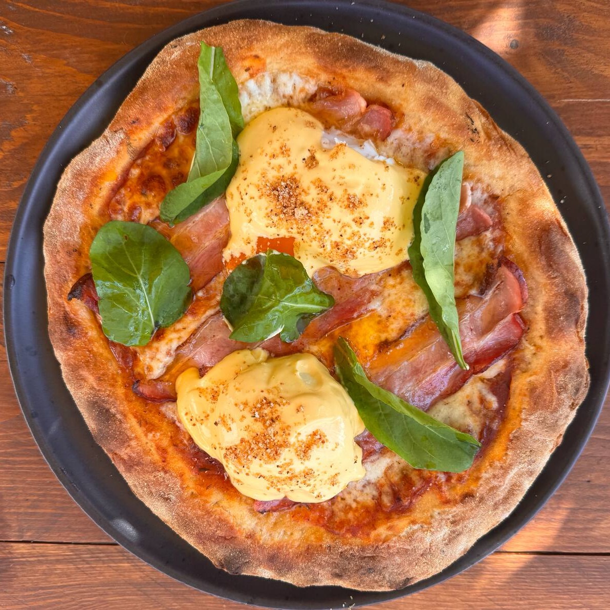 Benedita – a pizza que você nem sabia que precisava Com massa artesanal, bacon, ovo com gema mole, queijo, cremoso molho à base de ovos e leve toque de mostarda e aquela farofinha crocante no final. Pra quem ama café da manhã… a qualquer hora do Dia. Sim, é diferente. Sim, é maravilhosa é brunch em forma de pizza.