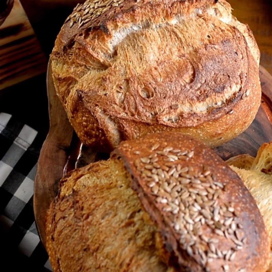 Pão fermentação longa e natural com 70% de farinha integral, enriquecido com 7 grãos, crocante por fora e macio por dentro.