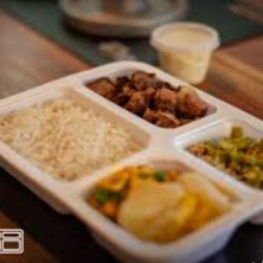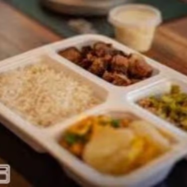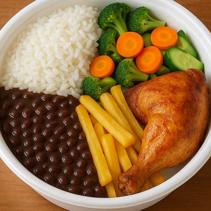 Arroz, feijão ,farofa, fritura do Dia. Proteína escolhida no Dia, peso total 650g