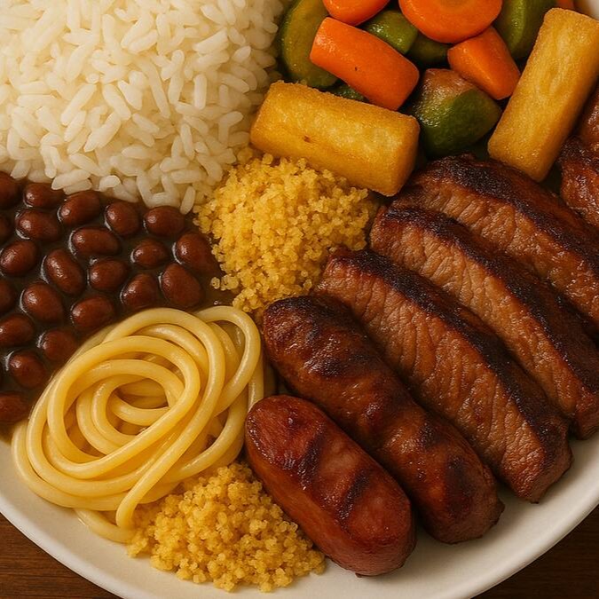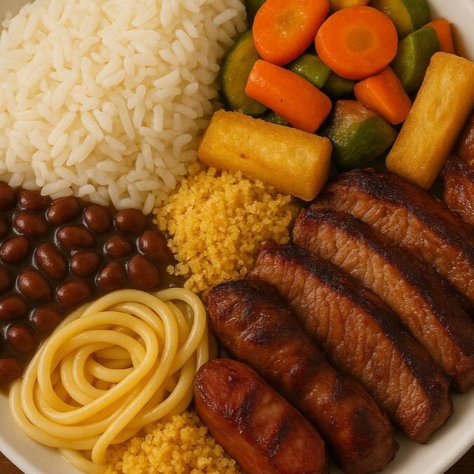 arroz, feijão, legumes, fritura, macarrão, farofa, 200 gr de churrasco.