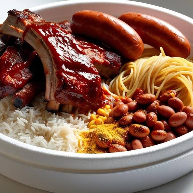 500g de Costela bovina, 5 linguiças, Arroz, farofa, maionese, fritura do Dia. Para 2 Pessoas